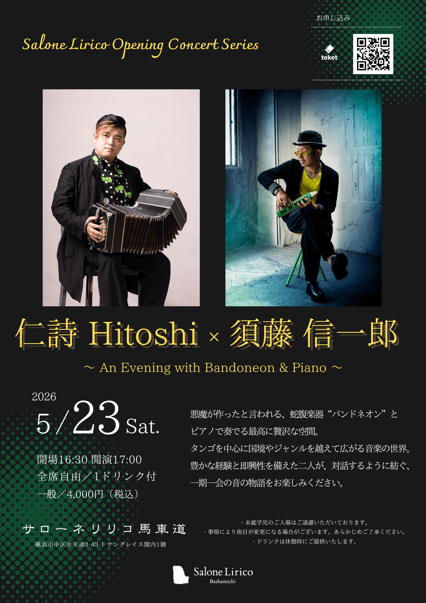 サローネリリコ馬車道は、地域に根付いた文化と芸術の発展を目指す小さなサロンホールです。歴史ある街並みに調和する落ち着いた空間には、「スタインウェイB211」を常設。豊かな響きとともに、ピアノコンサートや室内楽、声楽コンサートなど、多彩な音楽シーンを演出します。